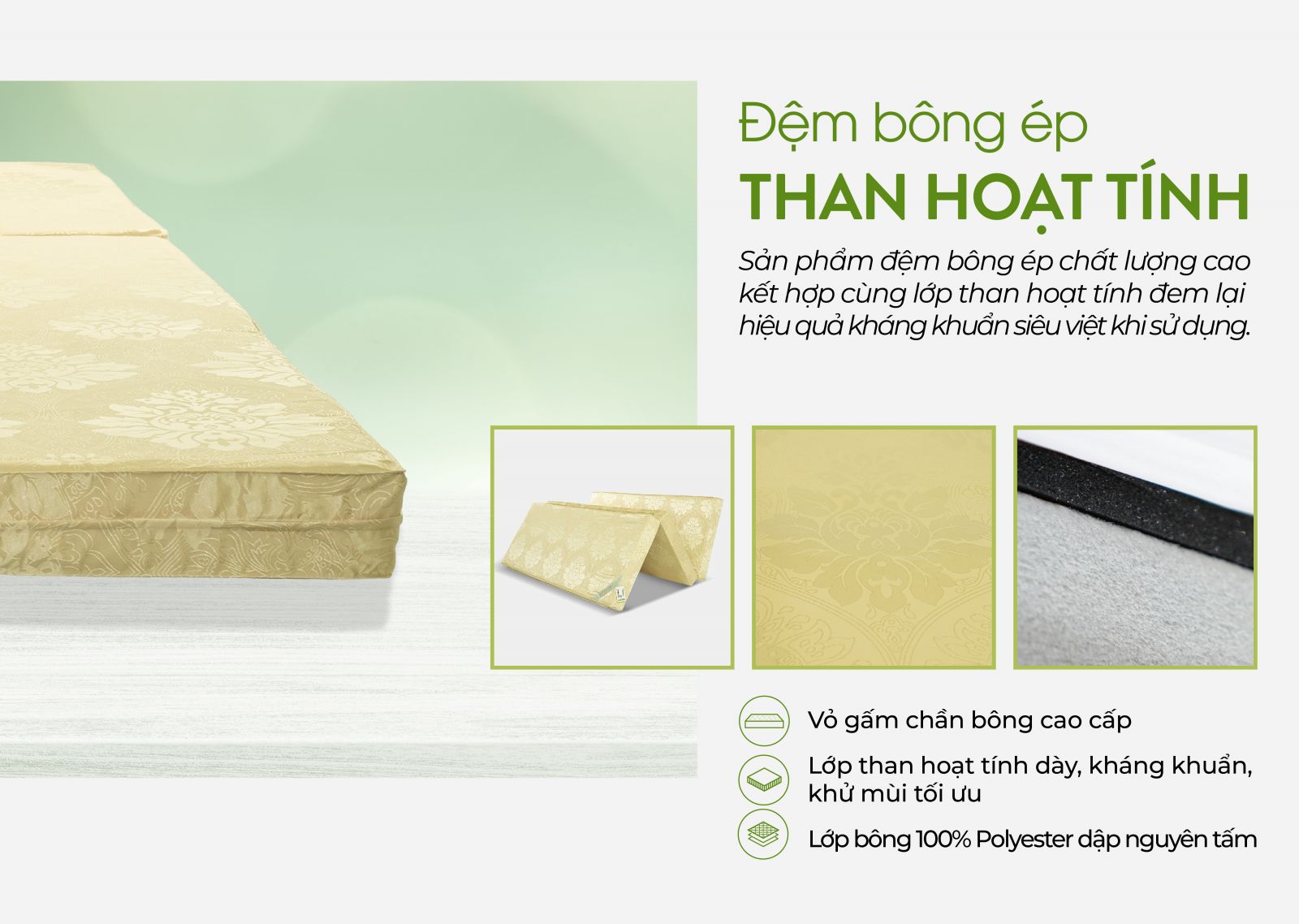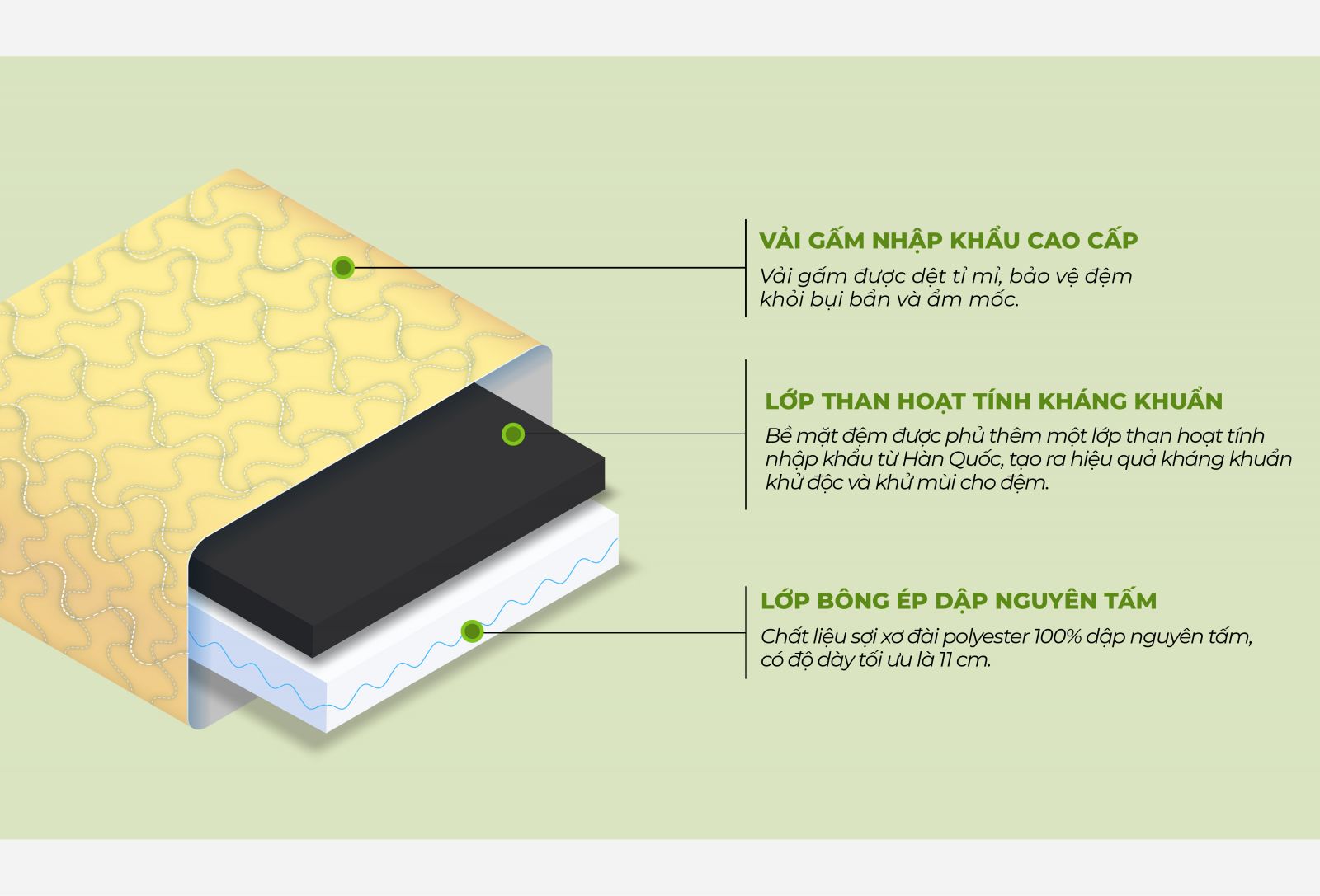 Điểm độc đáo trên sản phẩm này là bề mặt đệm được phủ thêm một lớp than hoạt tính nhập khẩu từ Hàn Quốc, tạo ra hiệu quả kháng khuẩn, khử độc và khử mùi cho đệm. Ruột đệm được làm chất liệu sợi xơ dài polyester 100% dập nguyên tấm, có độ dày tối ưu là 11cm. Điều này đảm bảo độ bền bỉ đáng kinh ngạc và một độ êm lý tưởng cho giấc ngủ của bạn. Lớp vỏ đệm được làm bằng chất liệu vải gấm cao cấp. Vỏ đệm chất lượng cao sẽ bảo vệ ruột đệm khỏi bụi bẩn không mong muốn.
